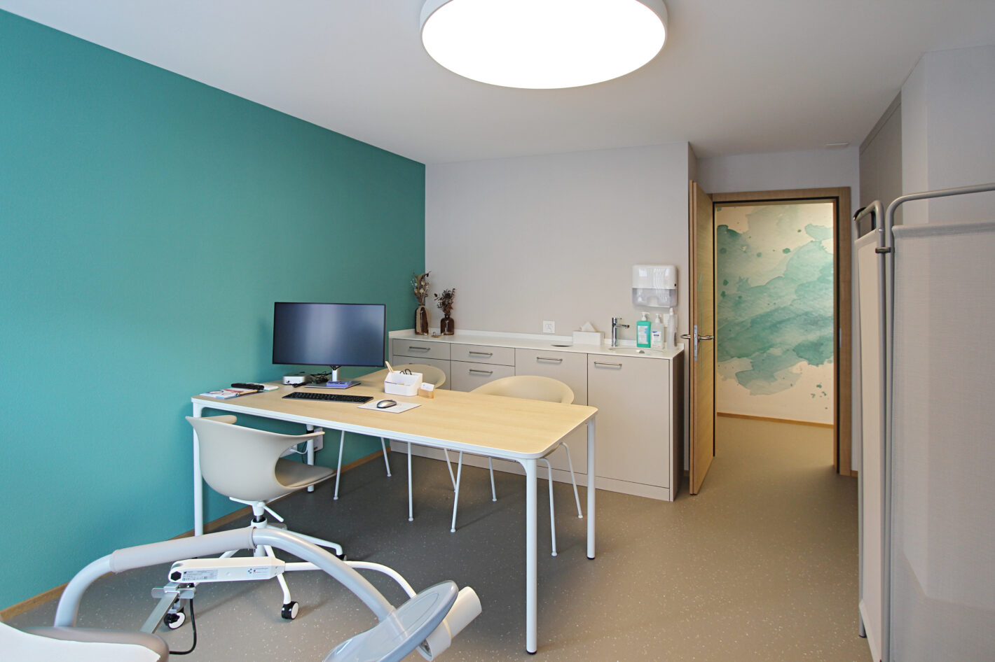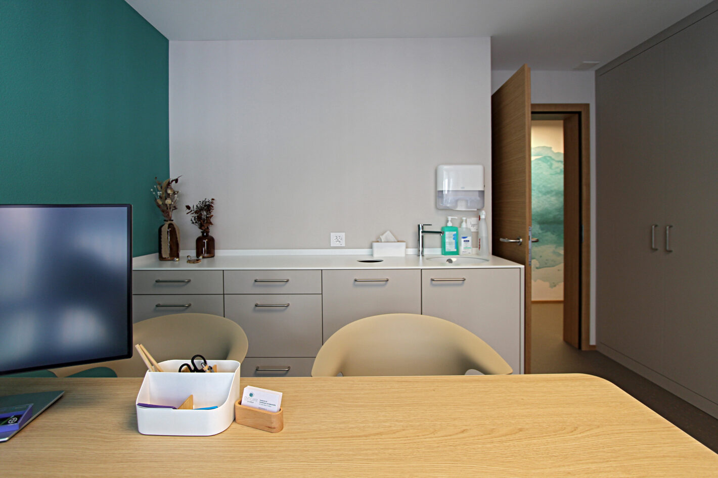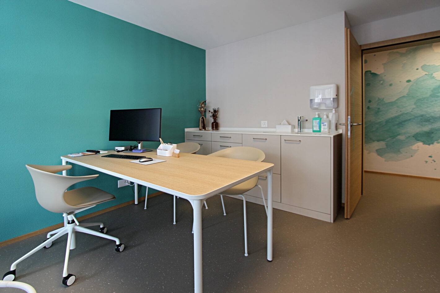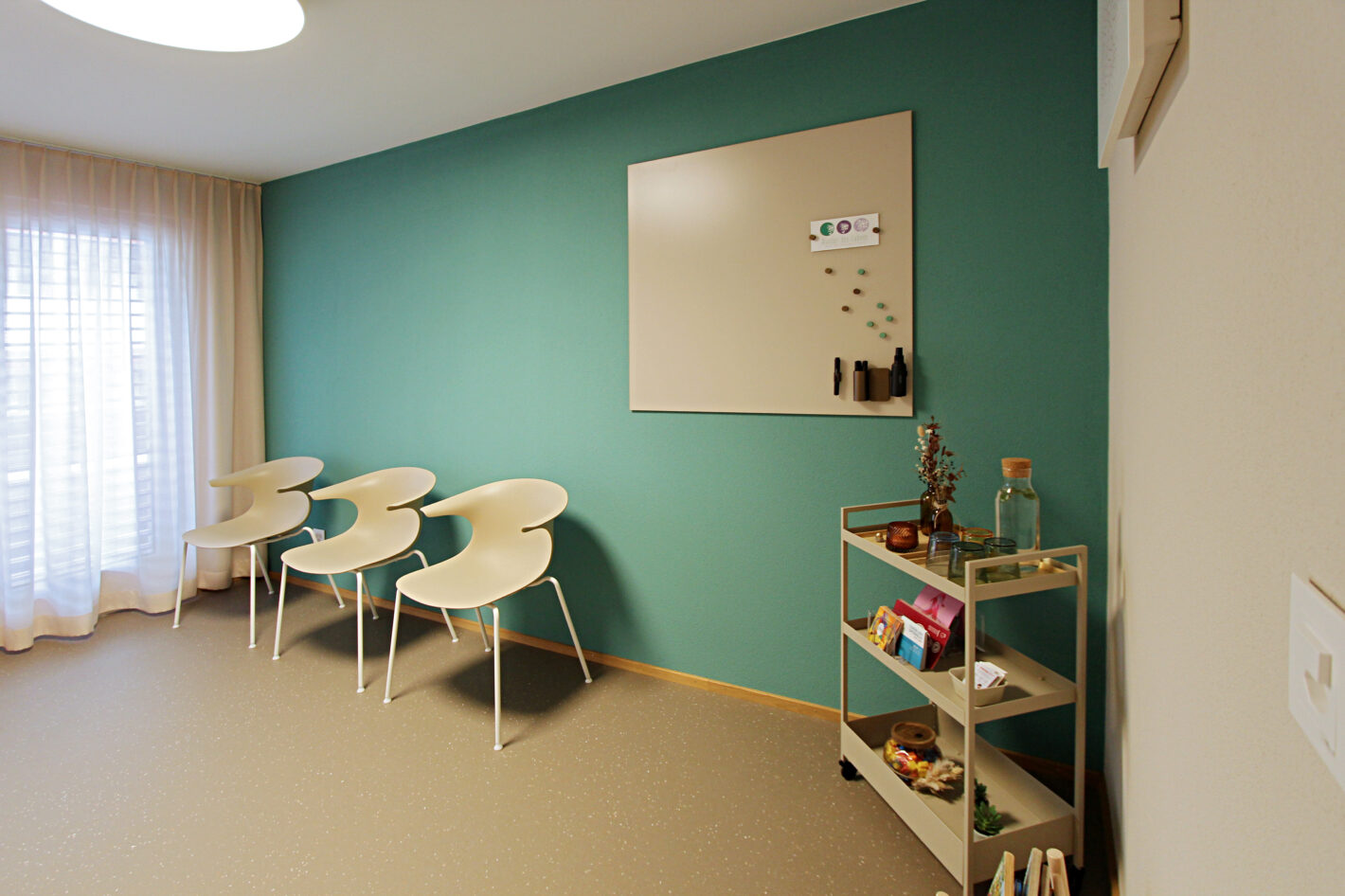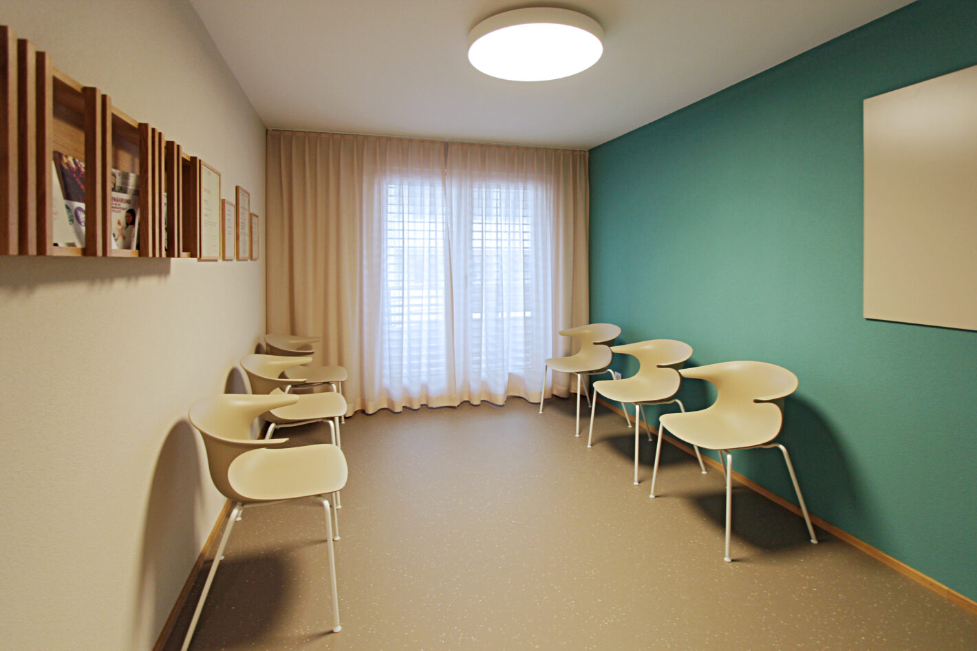 Durch den neuen Bodenbelag, die warme Wandfarbe und die minimalistischen Möbel ist eine moderne und warme Praxis mit viel Wärme entstanden. Die Farbakzente und die Wandtapete beleben die Räume und geben der Praxis eine klare Identität.