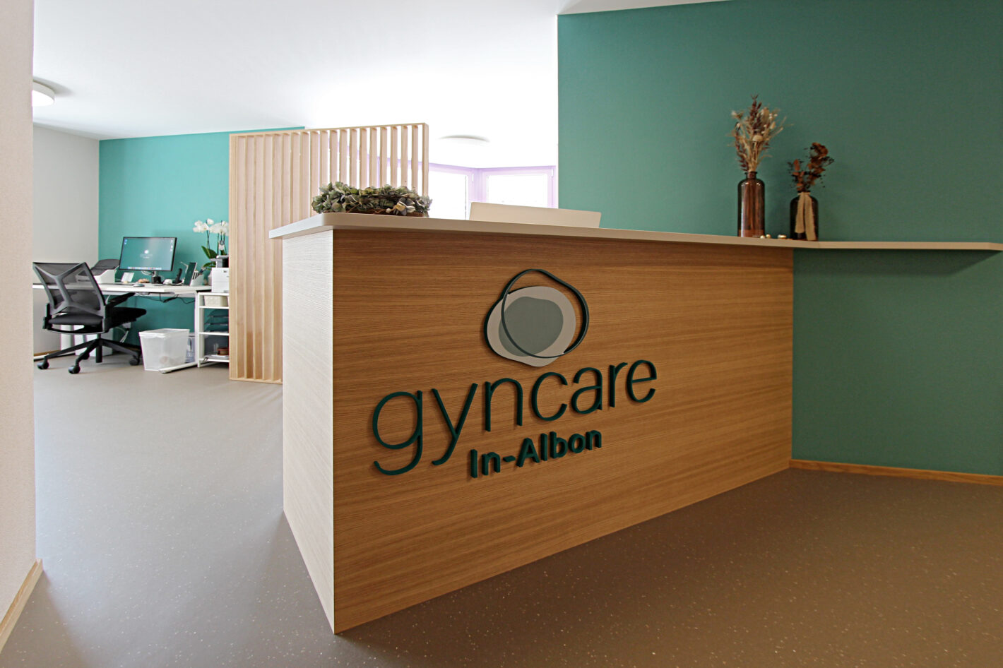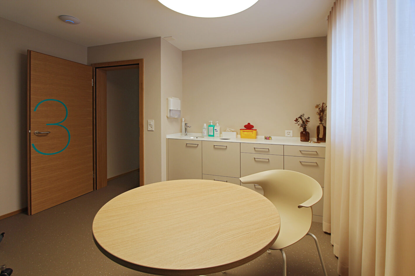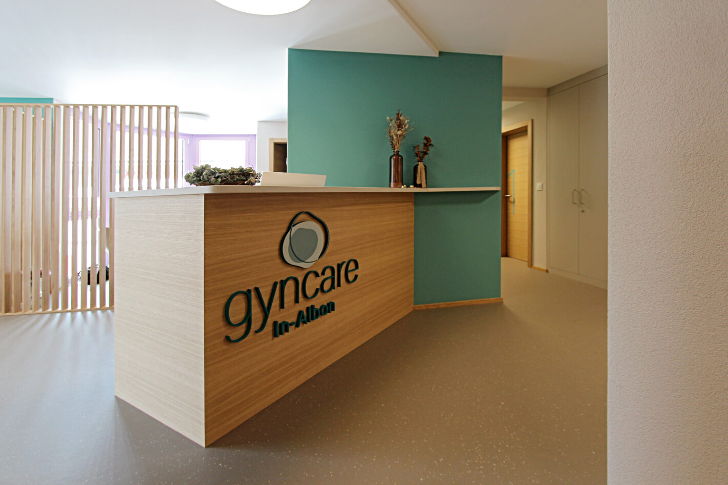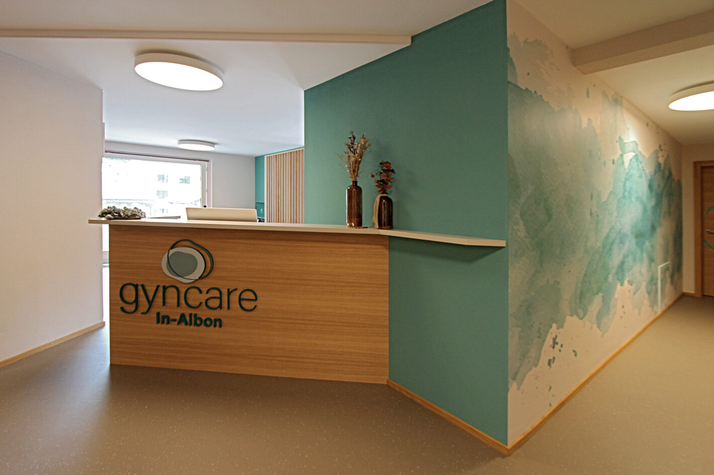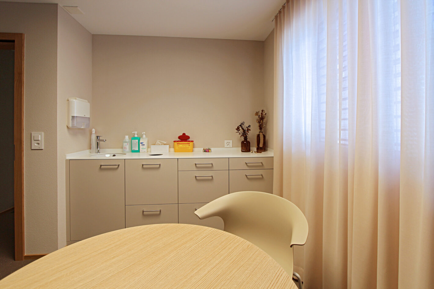 Durch den neuen Bodenbelag, die warme Wandfarbe und die minimalistischen Möbel ist eine moderne und warme Praxis mit viel Wärme entstanden. Die Farbakzente und die Wandtapete beleben die Räume und geben der Praxis eine klare Identität.