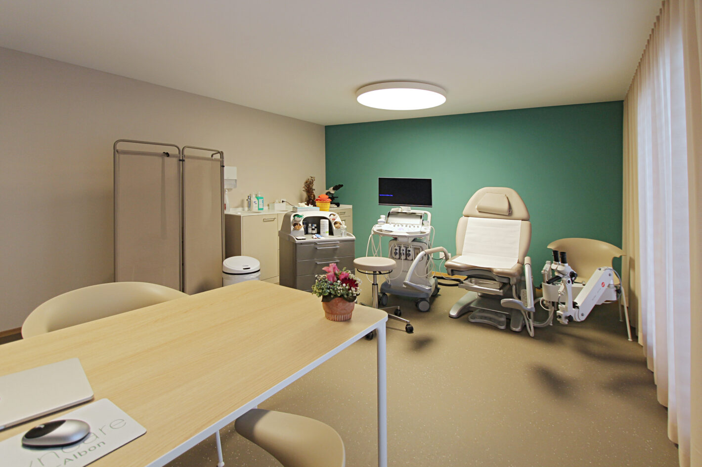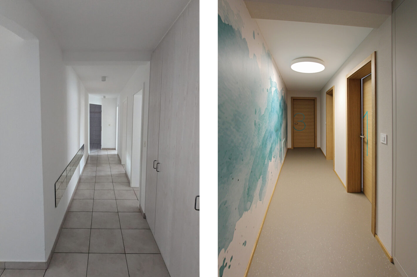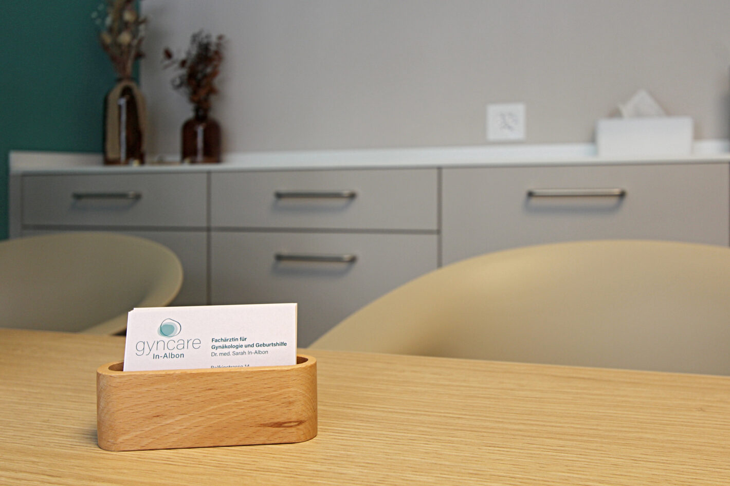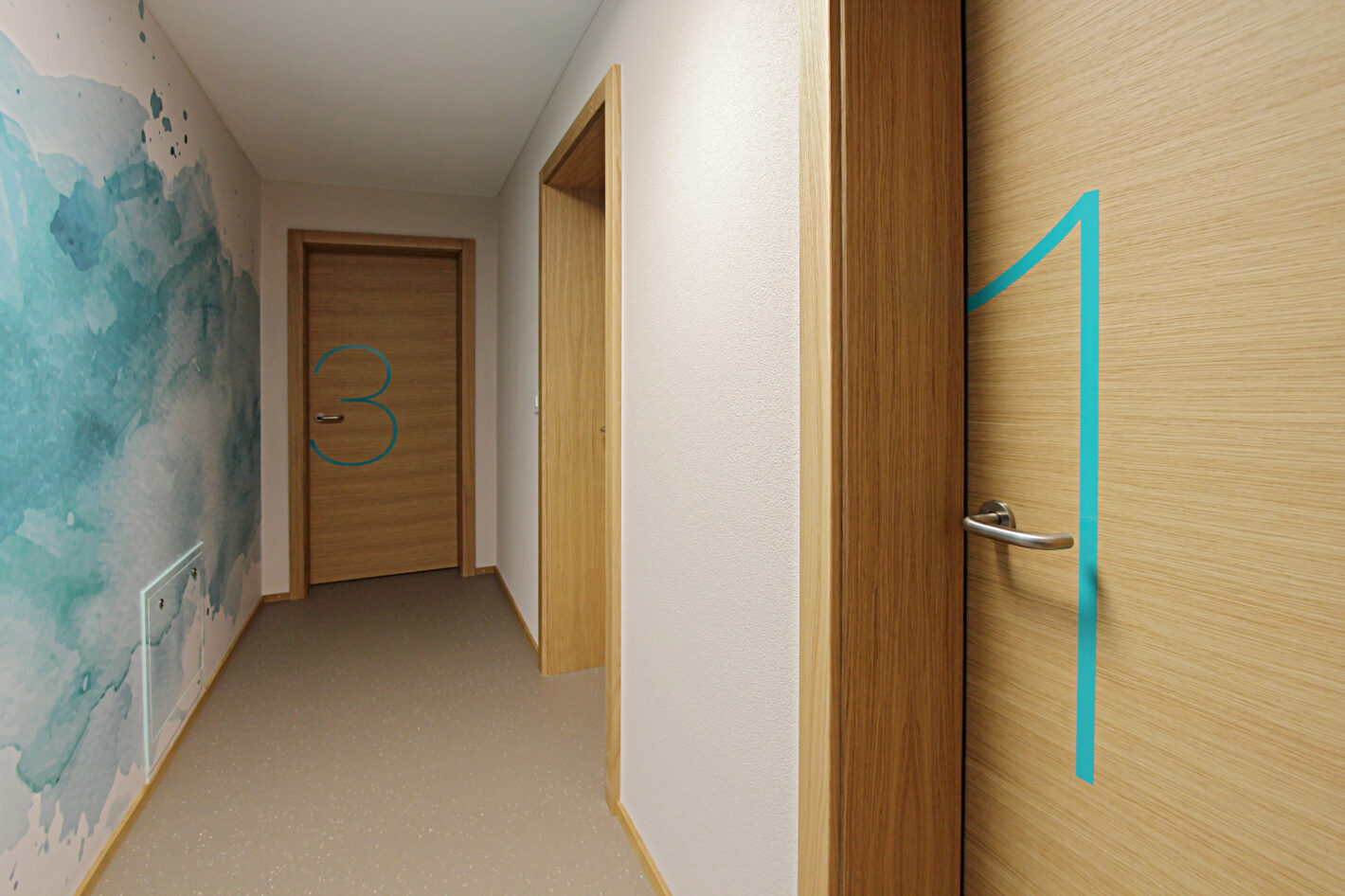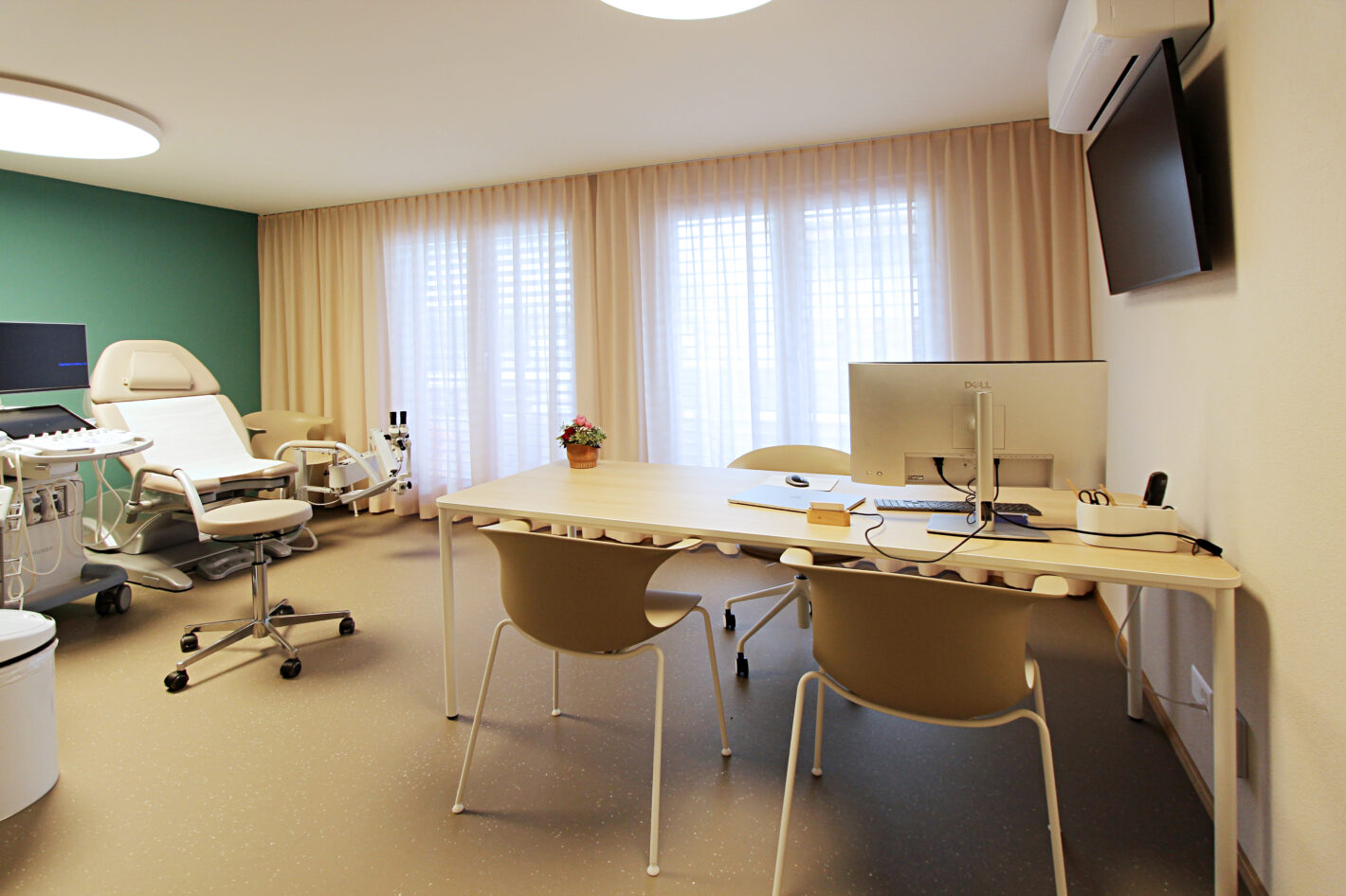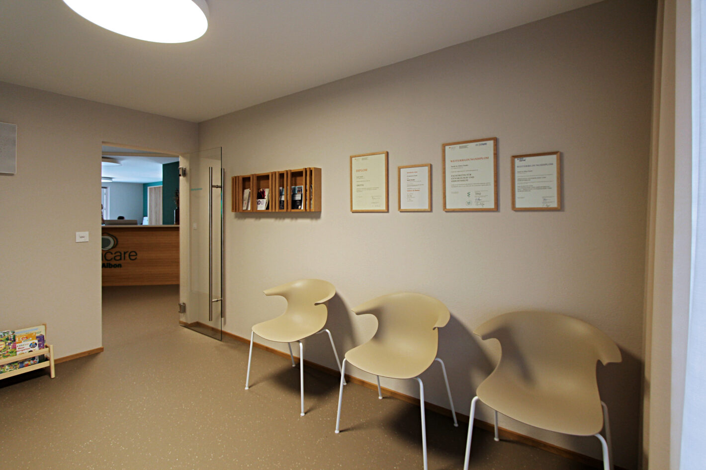 Durch den neuen Bodenbelag, die warme Wandfarbe und die minimalistischen Möbel ist eine moderne und warme Praxis mit viel Wärme entstanden. Die Farbakzente und die Wandtapete beleben die Räume und geben der Praxis eine klare Identität.