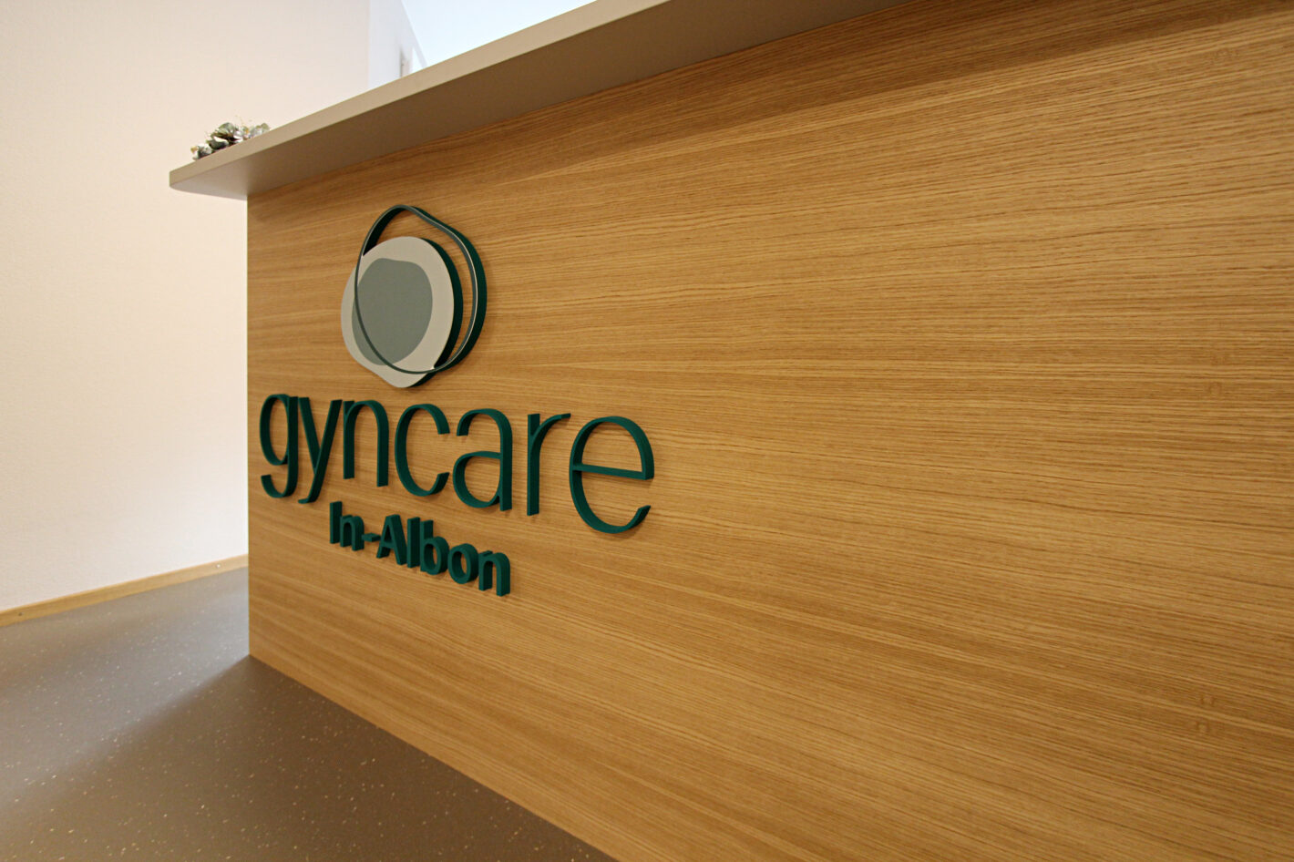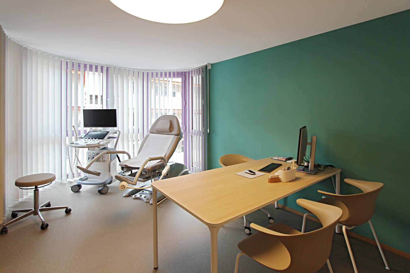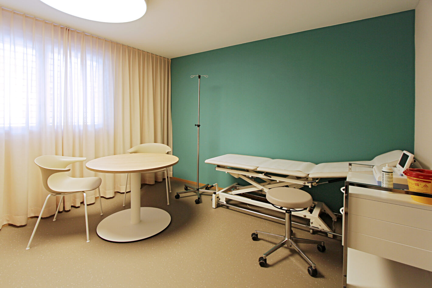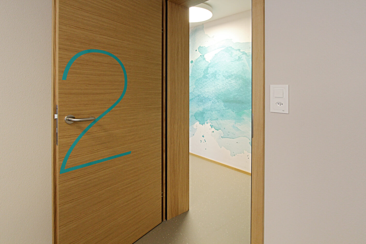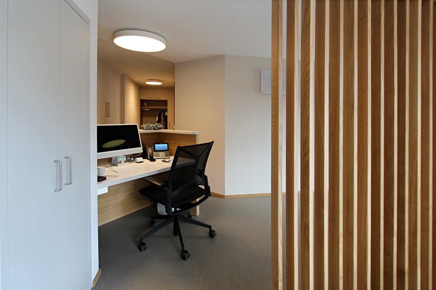 Durch den neuen Bodenbelag, die warme Wandfarbe und die minimalistischen Möbel ist eine moderne und warme Praxis mit viel Wärme entstanden. Die Farbakzente und die Wandtapete beleben die Räume und geben der Praxis eine klare Identität.