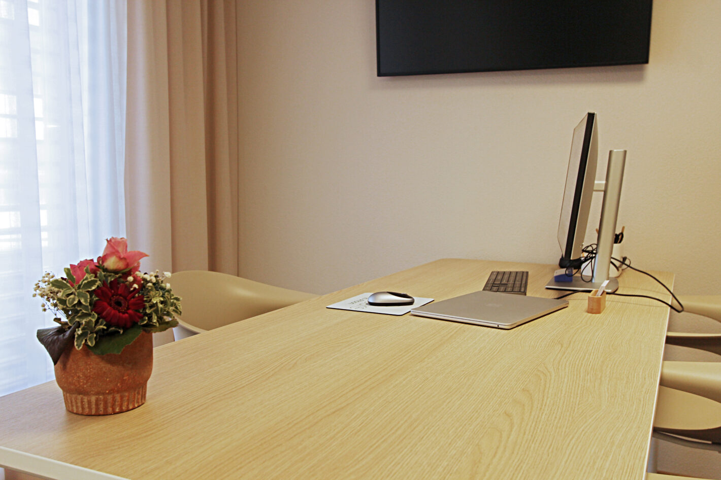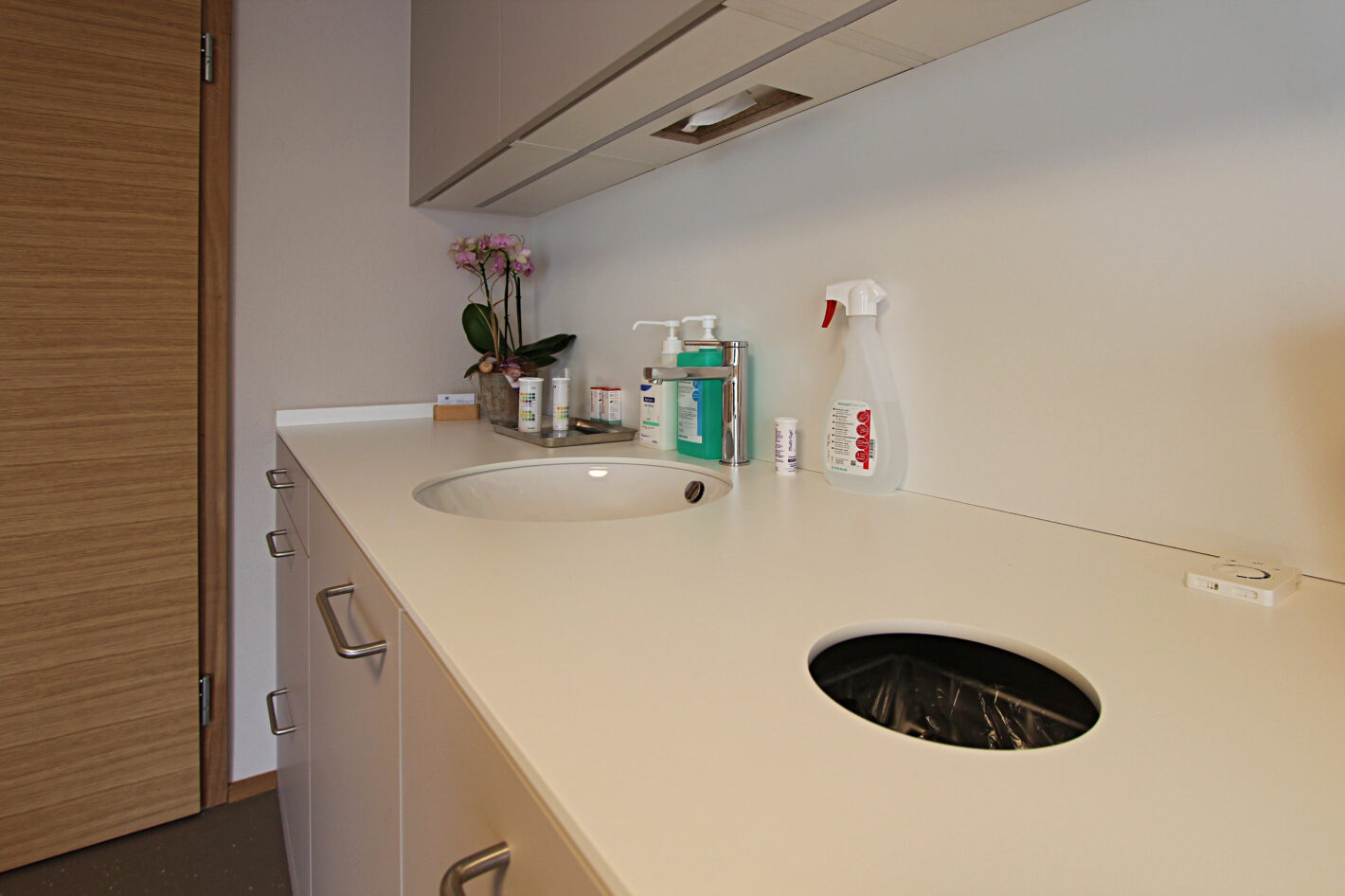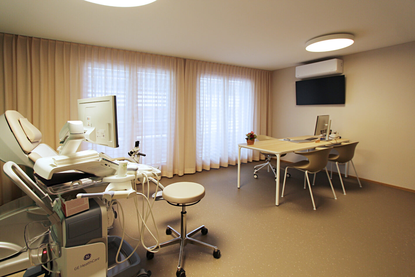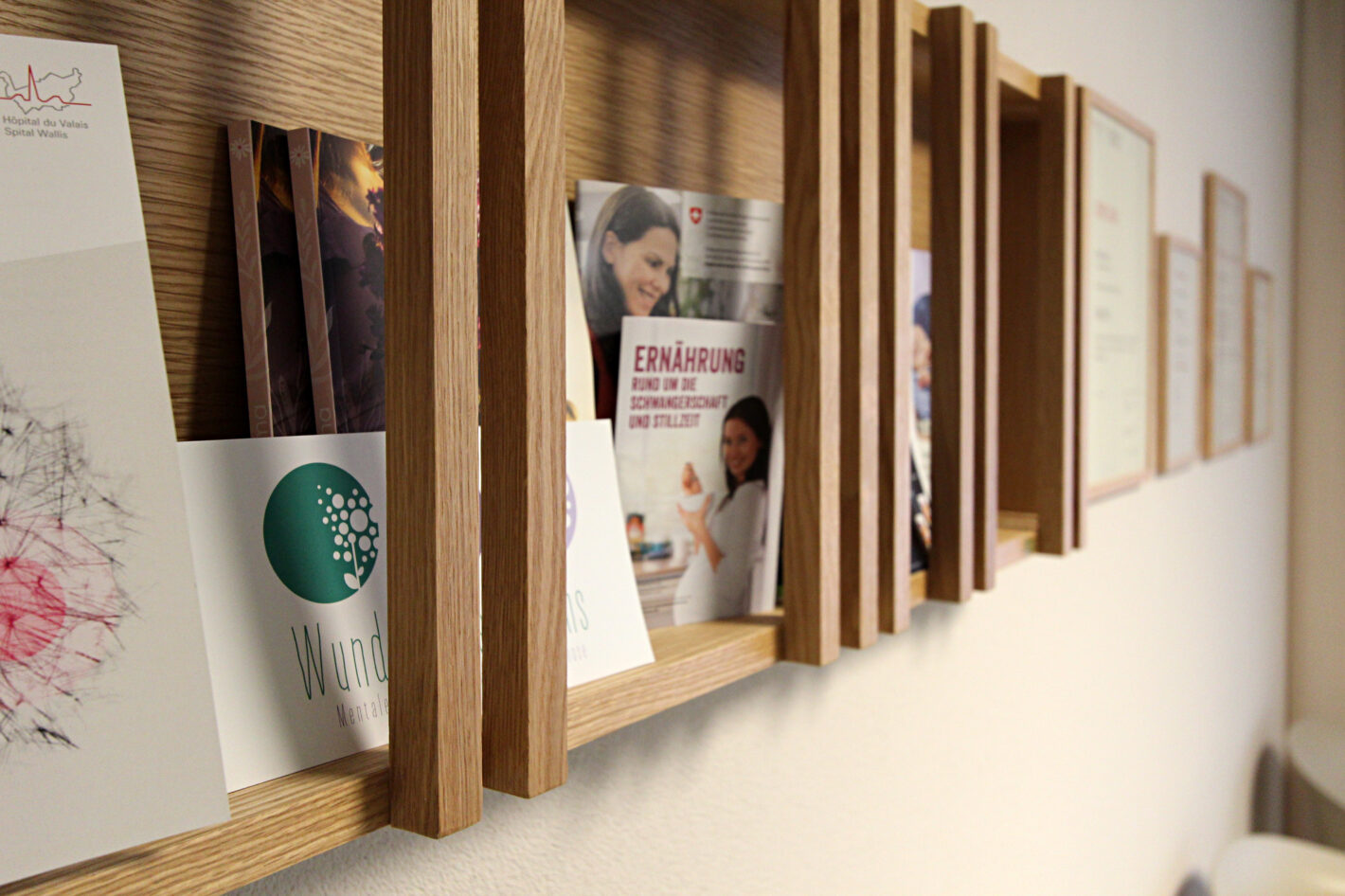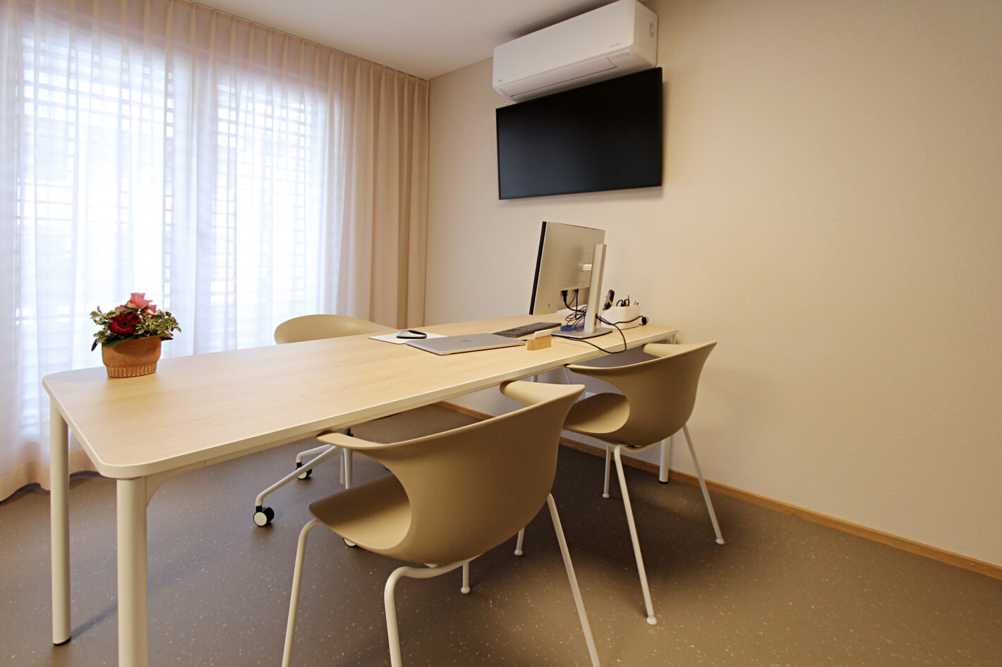 Durch den neuen Bodenbelag, die warme Wandfarbe und die minimalistischen Möbel ist eine moderne und warme Praxis mit viel Wärme entstanden. Die Farbakzente und die Wandtapete beleben die Räume und geben der Praxis eine klare Identität.